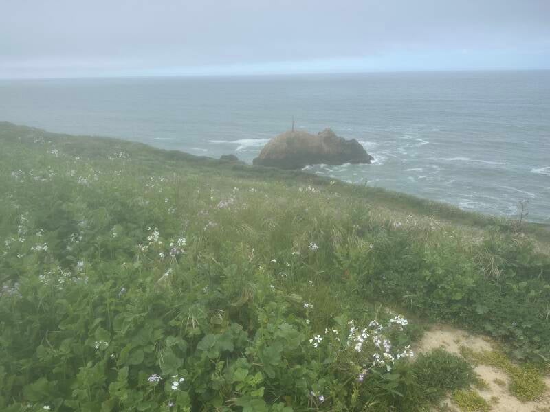 Mussel Rock Park in Daly City contains a roughly 2-mile trail loop that takes roughly 50 minutes to complete a hike. At some points the gravel trail would have an incline making it a challenge for runners. Mussel Rock Park is a coastal park that overlooks the Pacific Ocean to the west and a towering cliffside to the east. The park is named after the rock formation of the same name right off the shore at the park where the San Andreas Fault Line enters the Pacific Ocean. Mussel Rock Park is a special place where the ocean and land ecosystem collide to form a unique habitat filled with flora and fauna. Although this is a beautiful park, it is still sensitive to disasters. Landslides from the cliffs on the eastern side caused by heavy rain or earthquakes could bring in debris and sediment and decimate the park's ecosystem. When hiking here, take precautions and be ready at any moment.